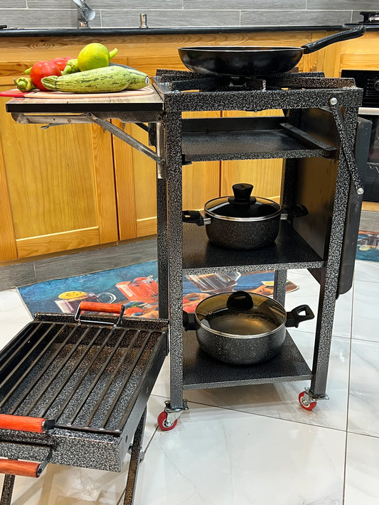 فرن احترافي متنقل للطهي و الشواء مع مساحة تقطيع و رفوف لتخزين الأواني
